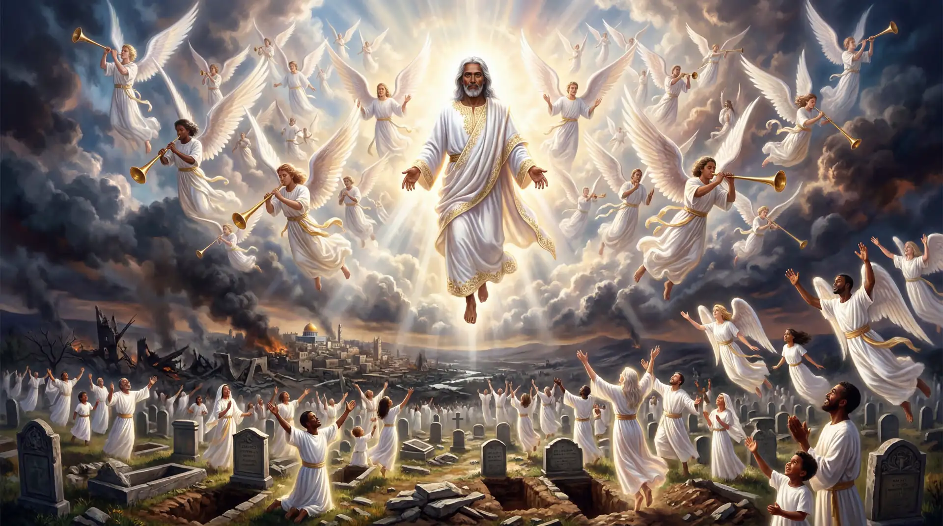 "Angels representing different ethnicities are blowing large golden trumpets, their sound implied visually through motion and power. From the distant earth below, graves are opening as resurrected saints rise bodily—men and women of all ages and ethnicities—clothed in incorruptible, radiant garments.
